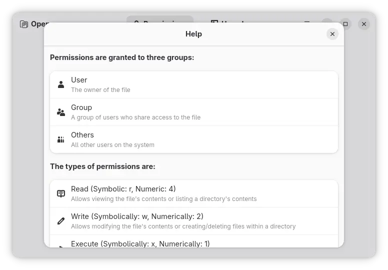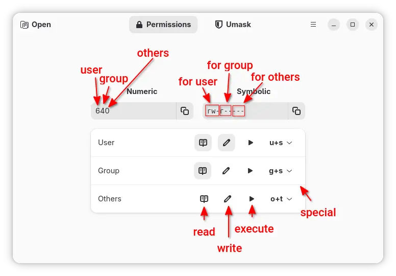 Besides umask, symbolic, and numeric representations, Concessio also support opening a file to see its permission and provides a help page that explains the Linux file permissions with text and examples.