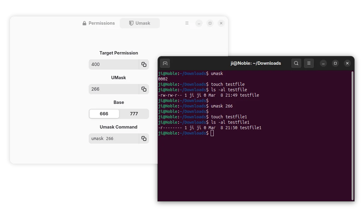 With version 0.3.0, the app added support umask page, that can help to determine the default permissions for newly created files and directories.