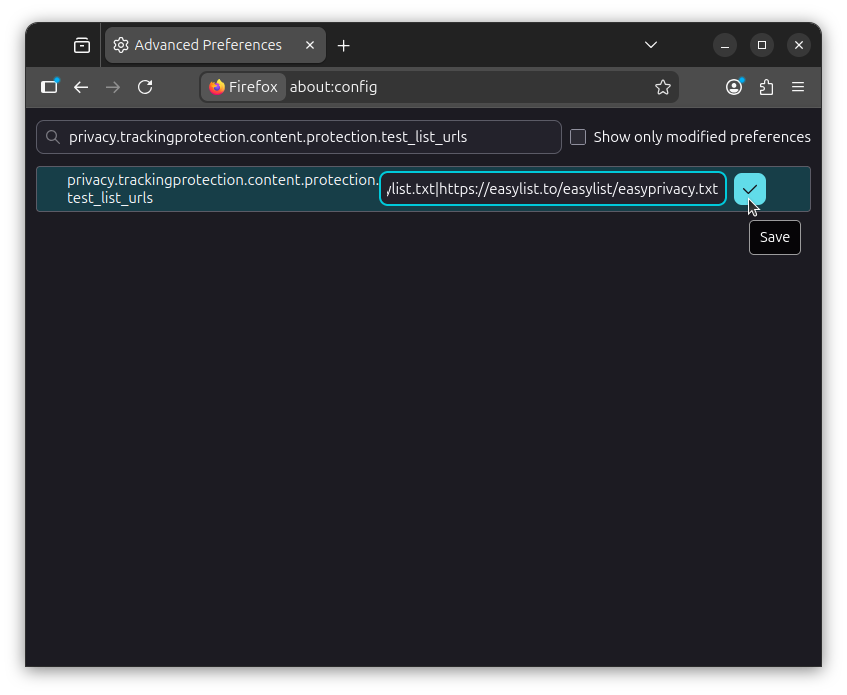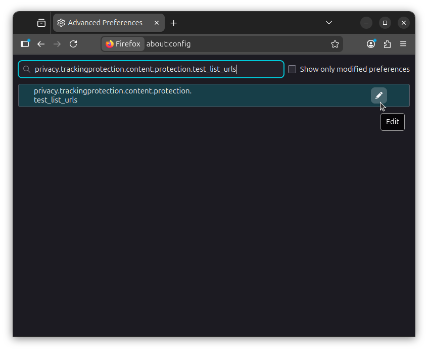 Next, search for privacy.trackingprotection.content.protection.test_list_urls, click on the "Edit" button, and paste the following value to add the EasyList and EasyPrivacy filter lists to Firefox: