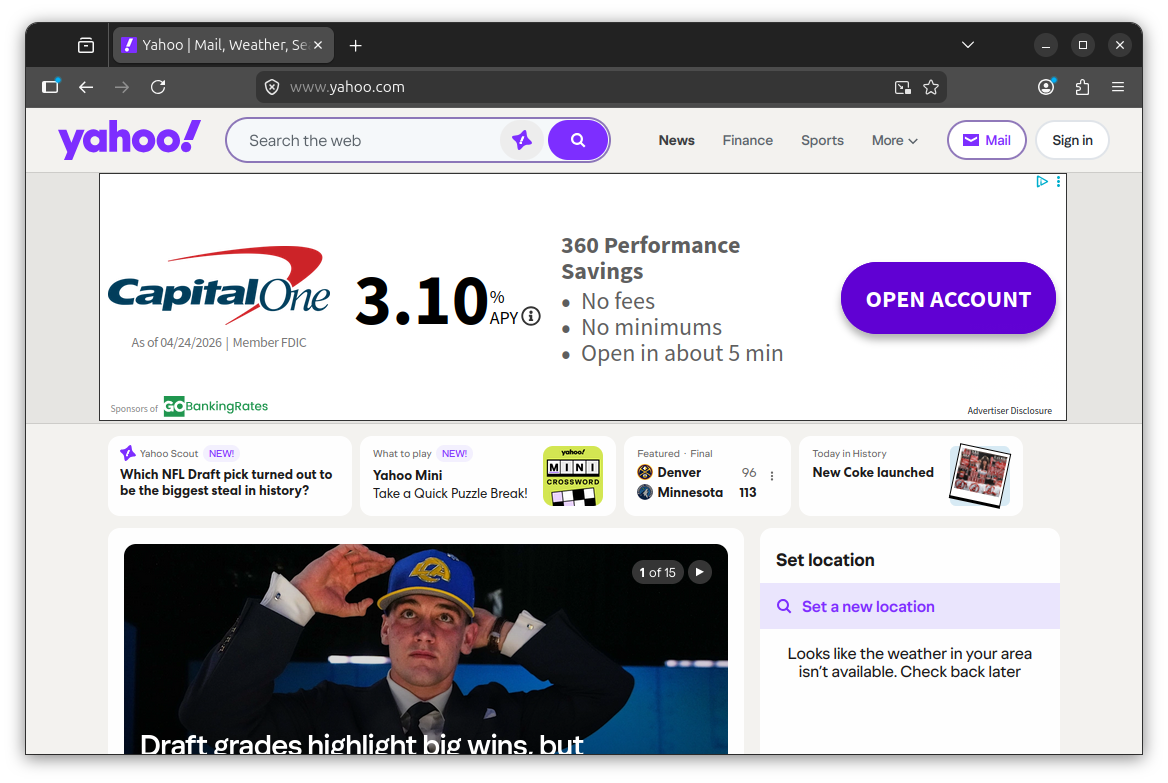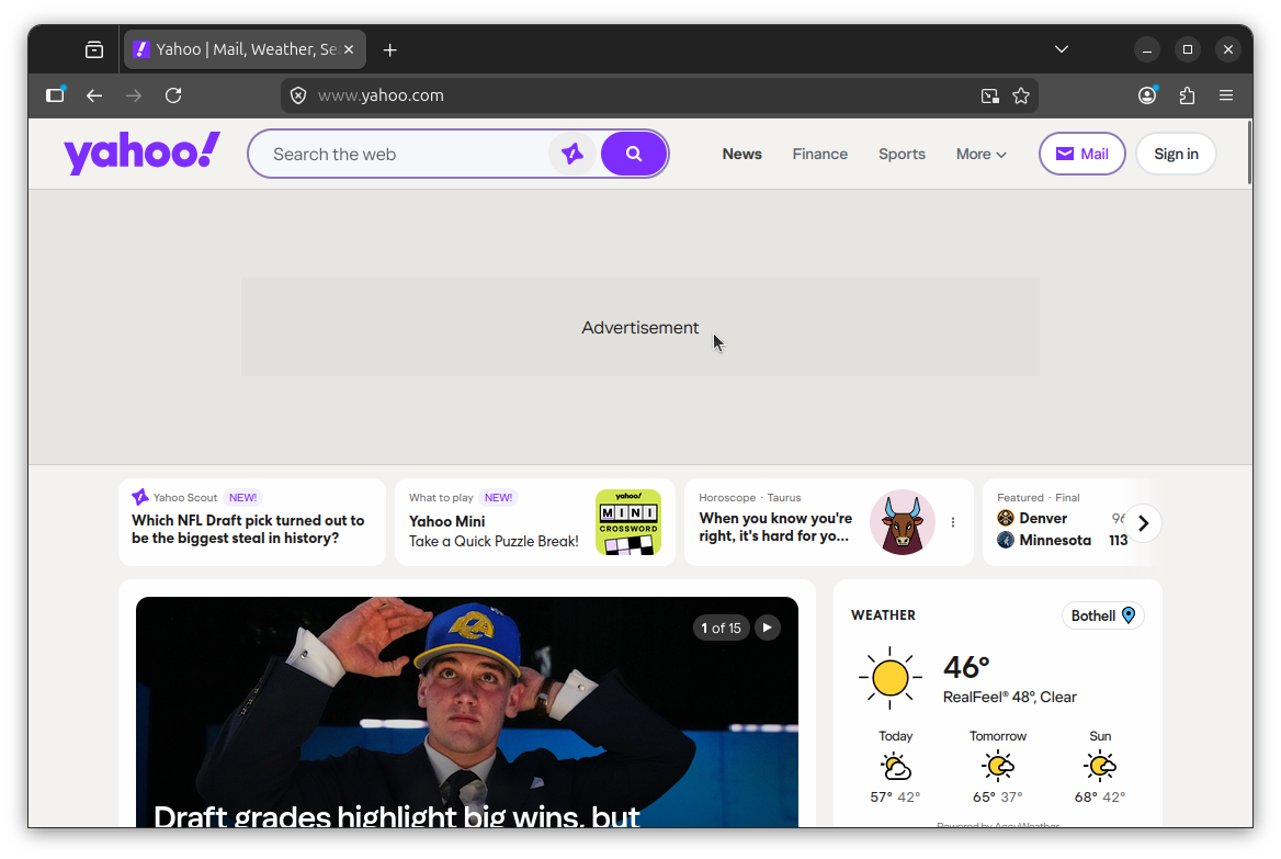 Now visit a site with known ads, like Yahoo (as I did above). If it's working, ad slots will still render in the page layout, but the actual ad content will be blocked. In my test, the banner on Yahoo came up showing only the text "Advertisement" with the advert bit stripped out.
