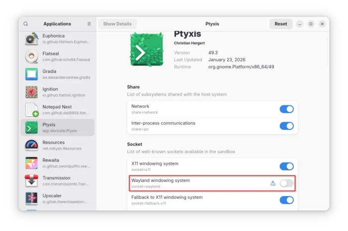 sudo flatpak override --nosocket=wayland --socket=x11 app.devsuite.Ptyxis