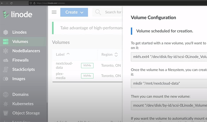 You can do this by clicking on "Volumes" within the dashboard, and then you can get started with the process. Fill out each of the fields while creating the block storage device. But pay special attention to the region - you want to set this to be the same region that your Linode instance is in.