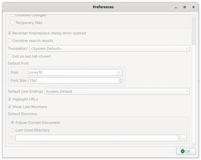 The preferences dialog has been updated with some new options. They include options to toggle line numbers and URL highlights visibility, and configure default directory for file saving.