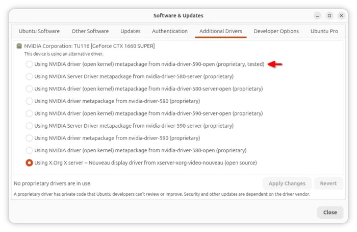Then, launch Additional Drivers. Choose install nvidia-driver-590 or nvidia-driver-590-open for desktop and gaming, or nvidia-driver-590-server or nvidia-driver-590-server-open for server and computing use. After installation, restart computer to apply change.