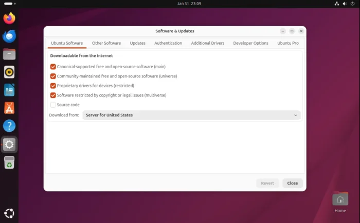 Software & Updates, the built-in tool for managing software sources, drivers, and Ubuntu Pro has been ported to GTK4, with a modern UI that’s well integrated with recent Gnome desktop environment.